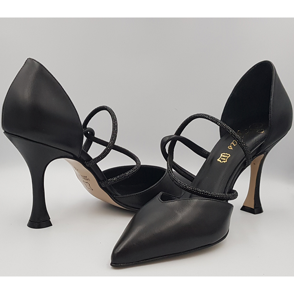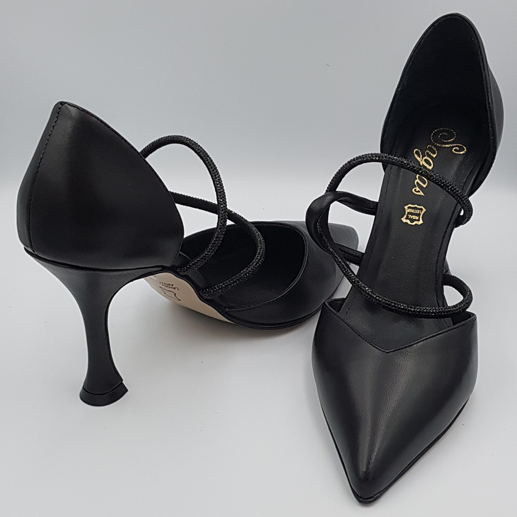 Black leather inside – outside, with black rhinestones that fits on the rocker, 8.5cm heel, non-slip sole and regular fit. Made in Greece.