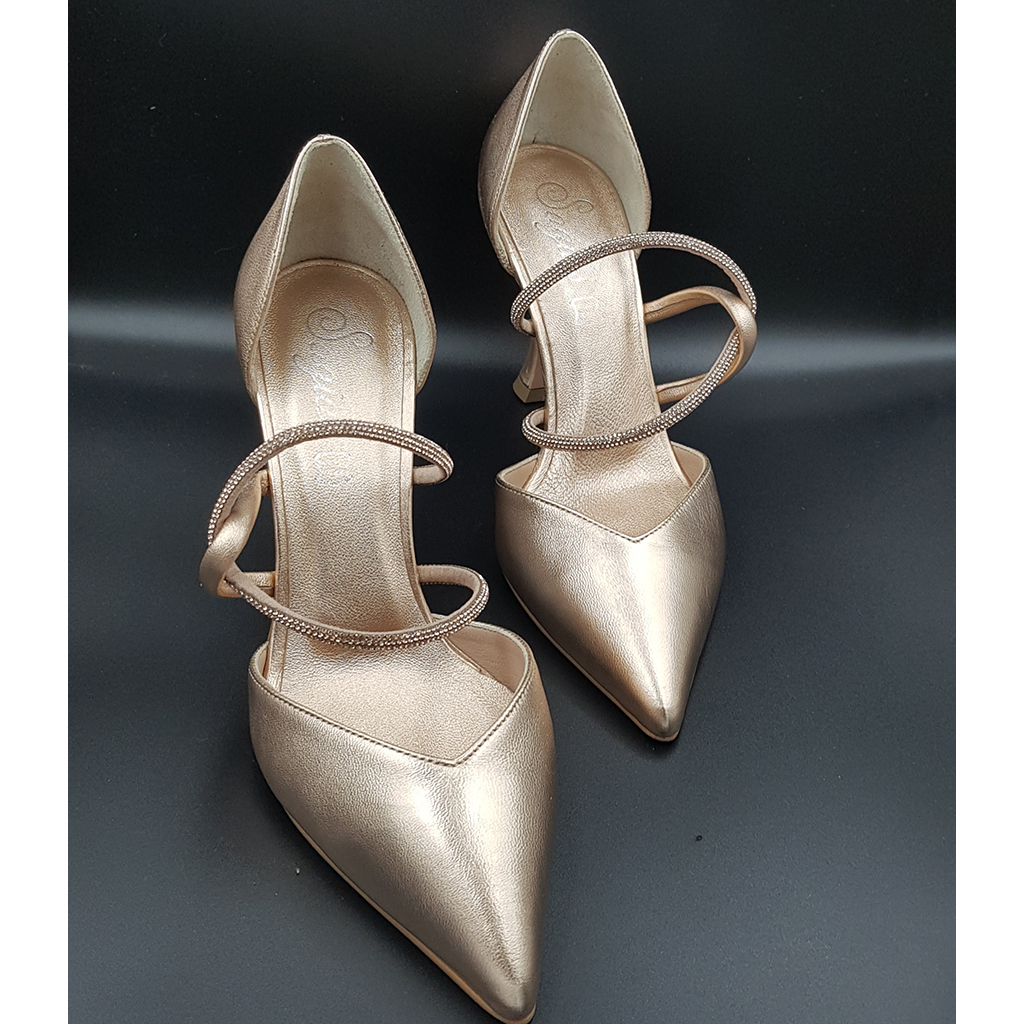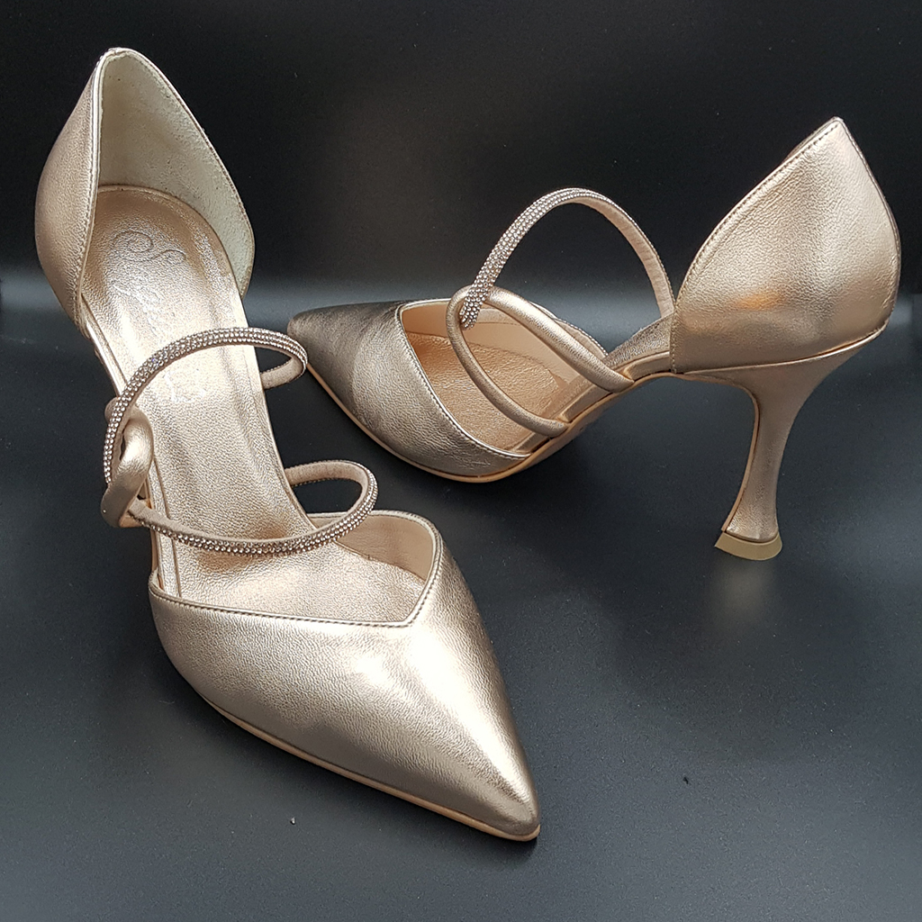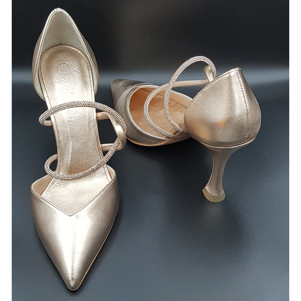 Bronze color leather inside – outside, with bronze rhinestones that fits on the rocker, 8.5cm heel, anti-slip sole and regular fit. Made in Greece.