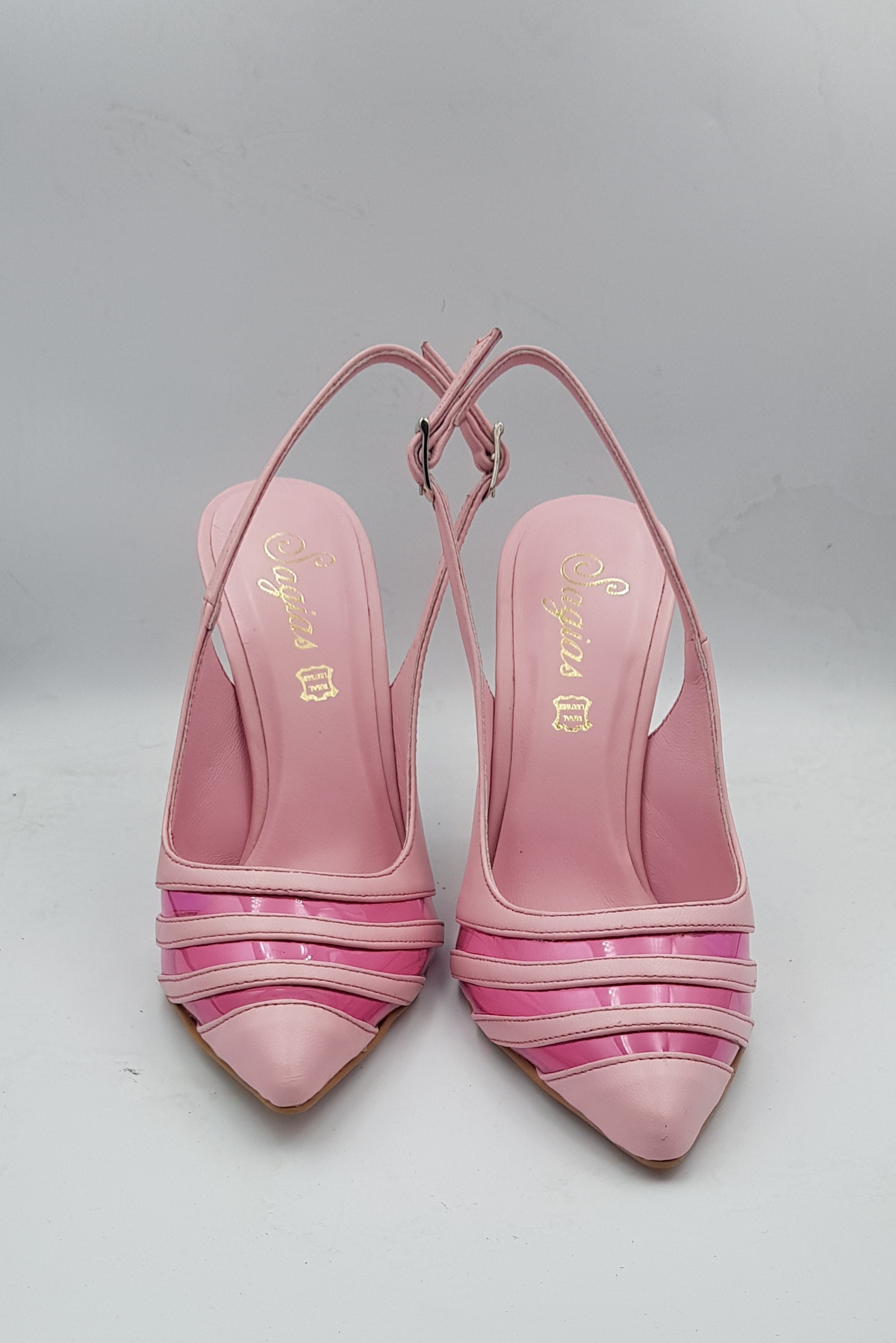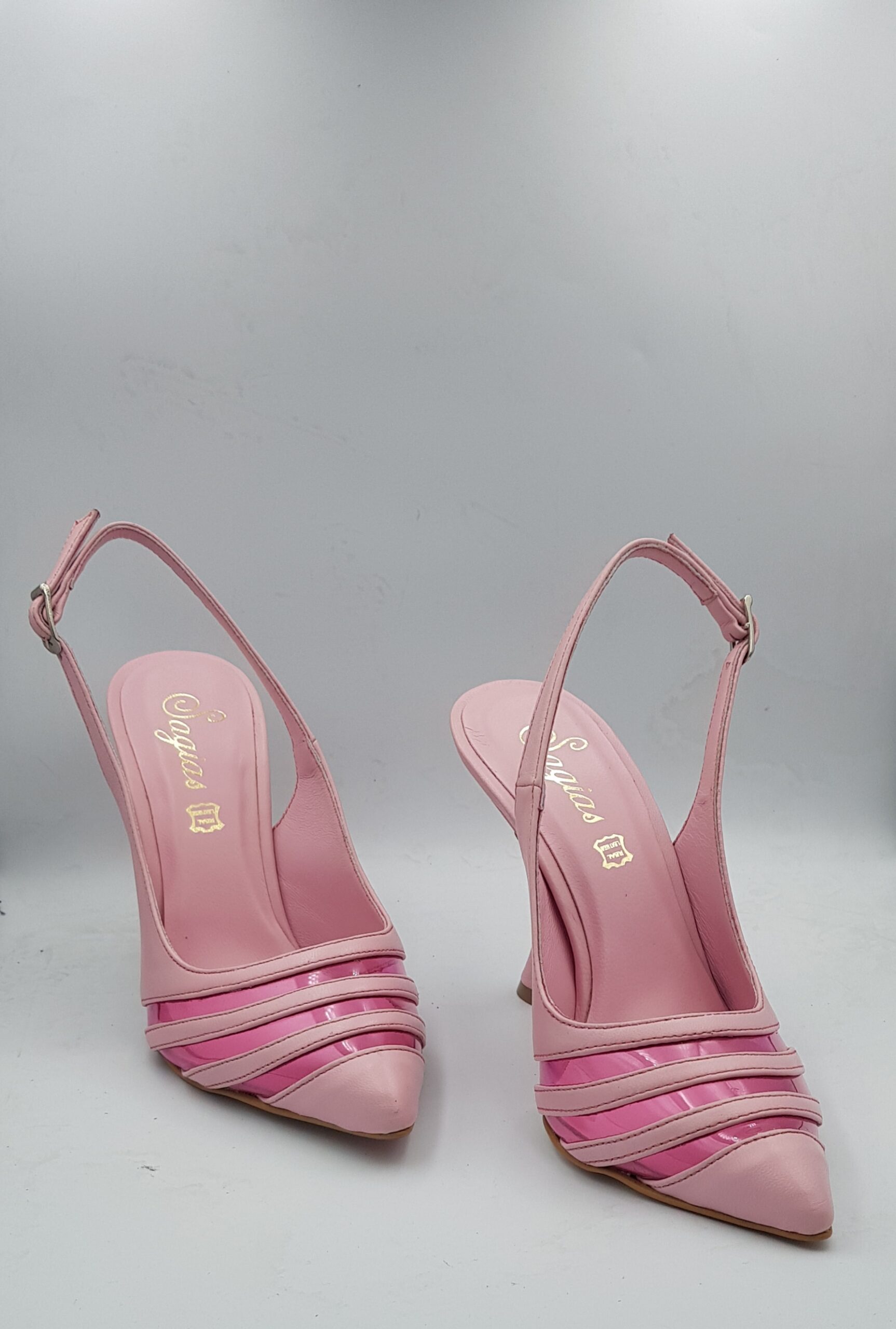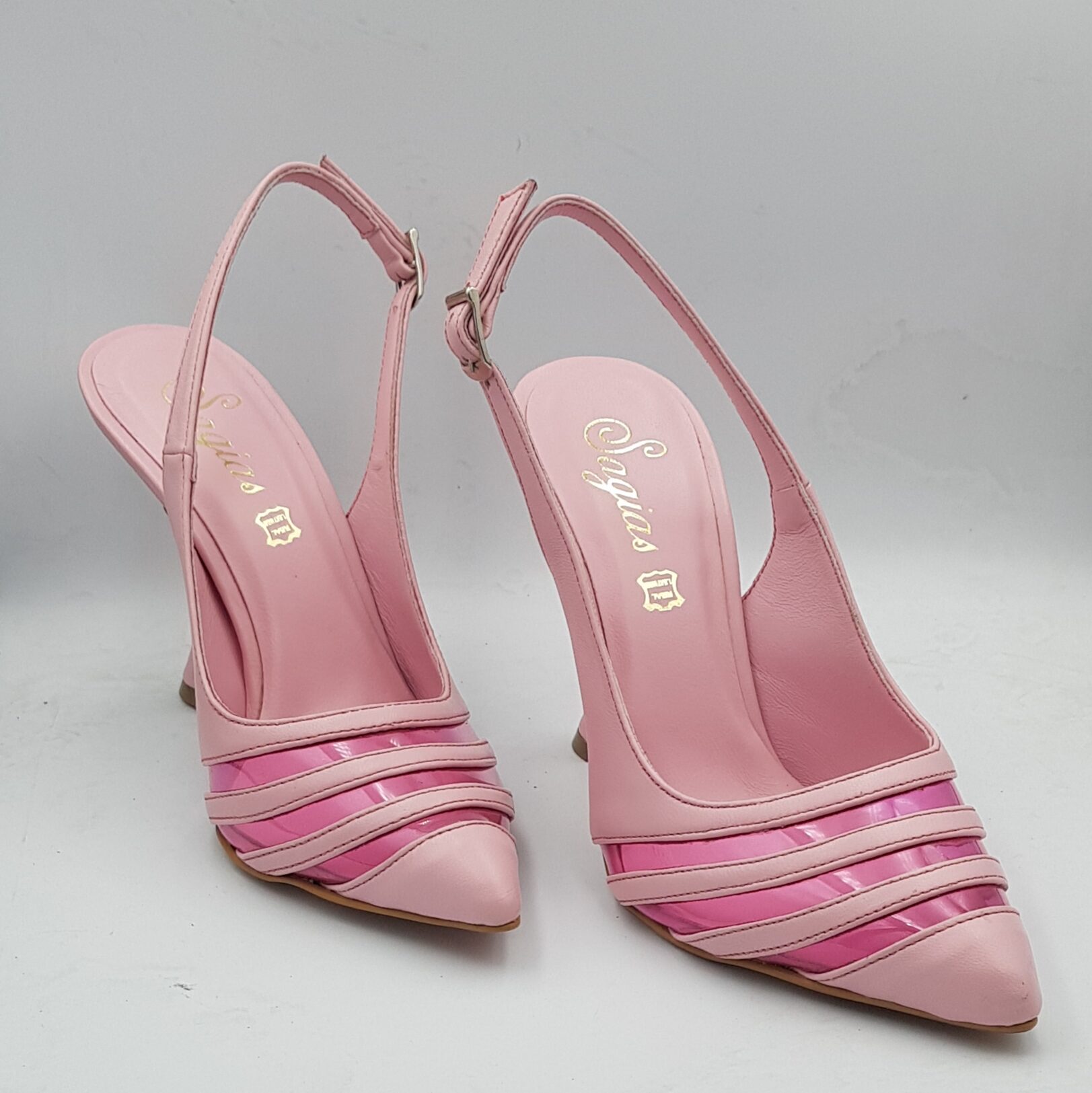 Pink leather inside out with pink transparently. 9,5 cm heel, non slip sole and regular form.