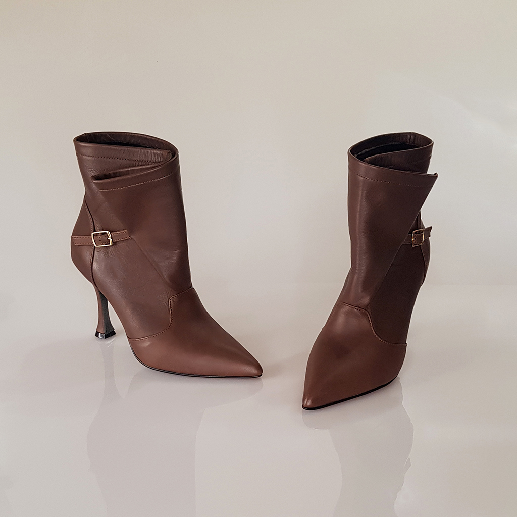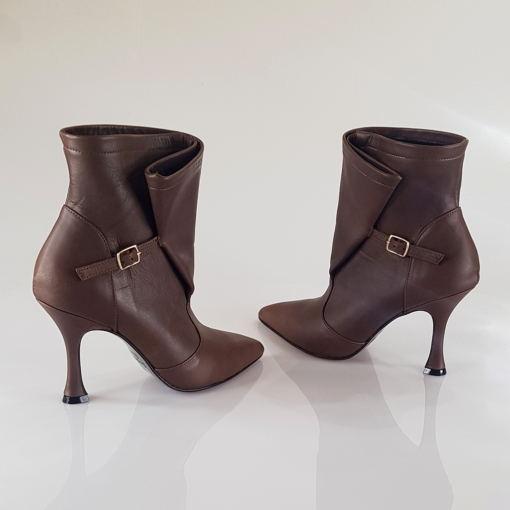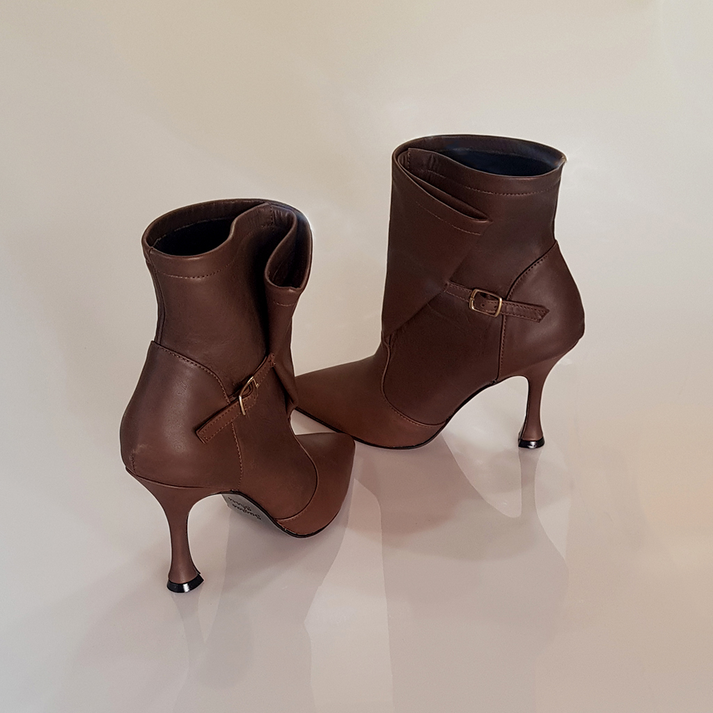 Leather boot chocolate color, 8.5cm heel with non-slip sole.