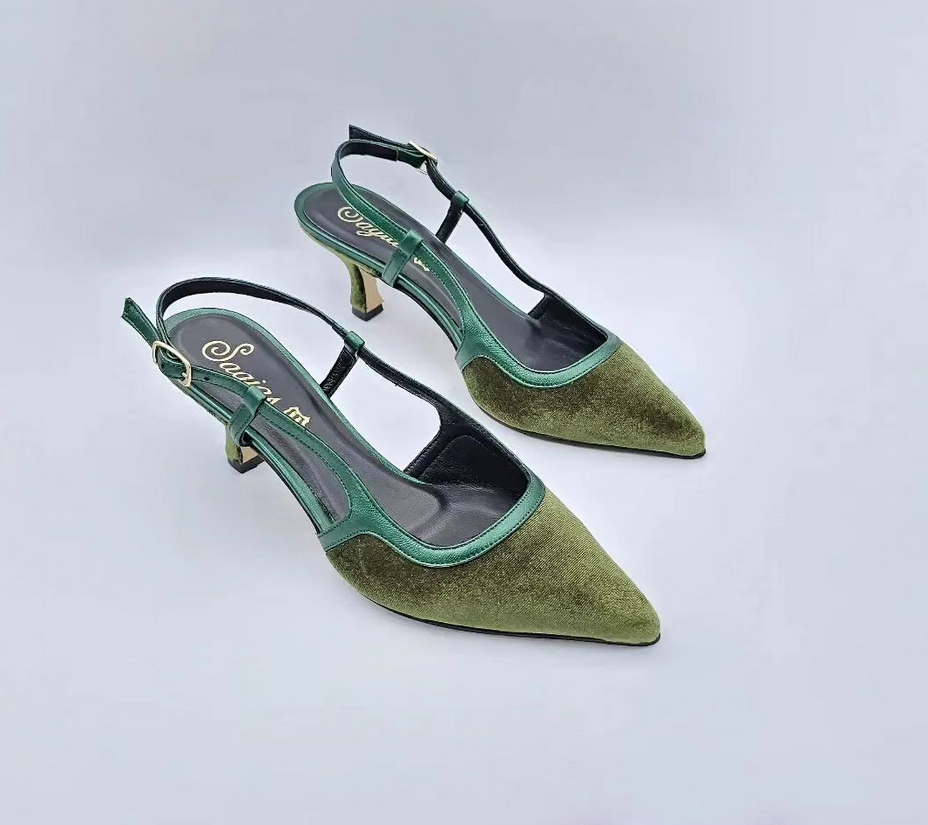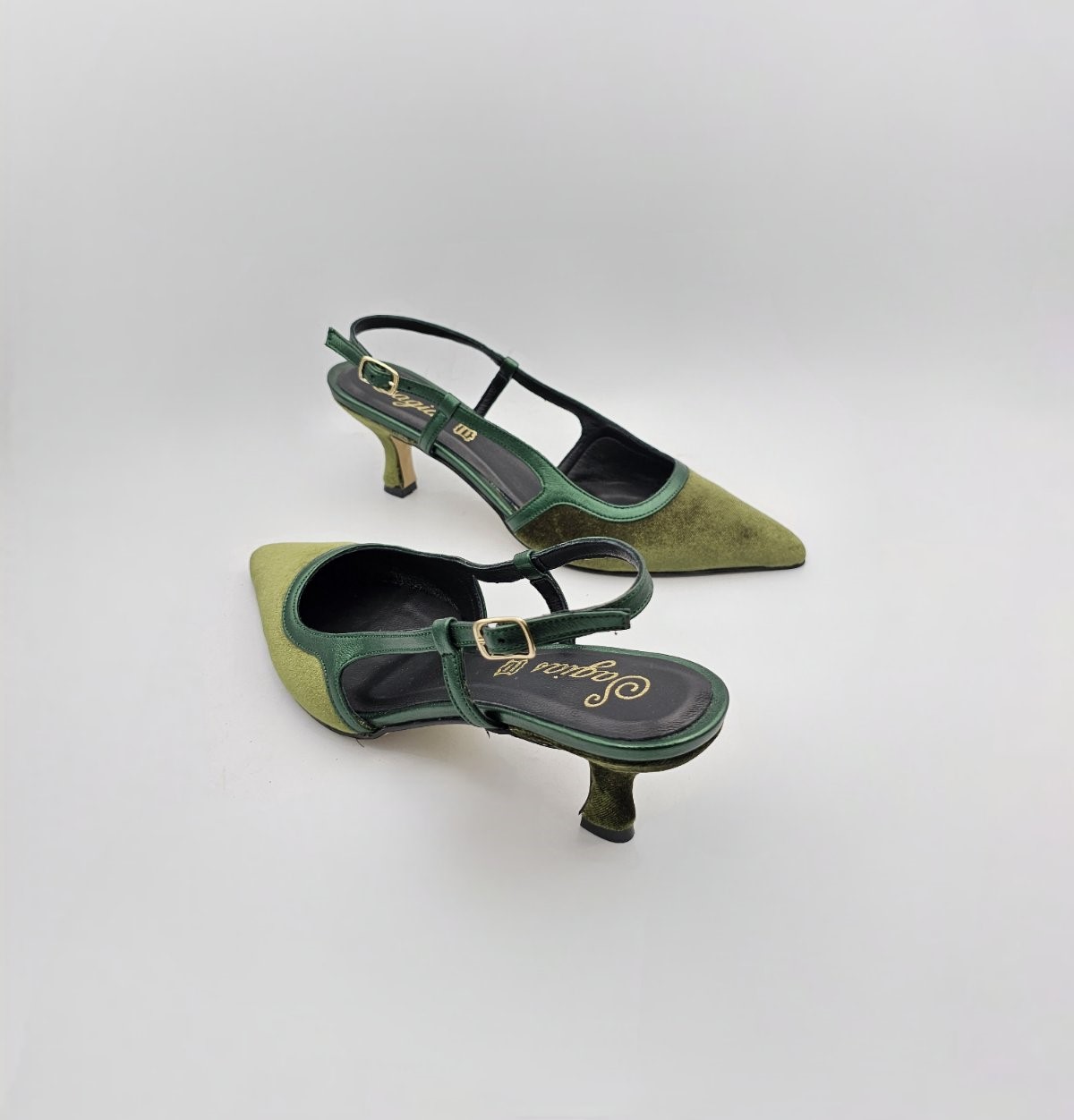 Olive – green velvet with black leather inside.5.5 cm heel, non slip sole and regular shape. Made in Greece.