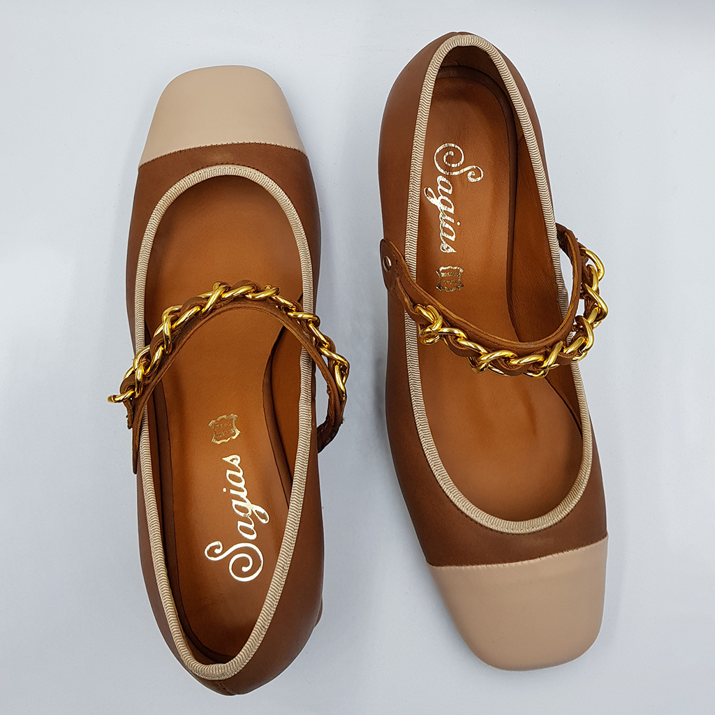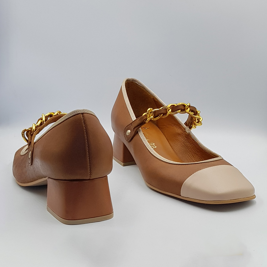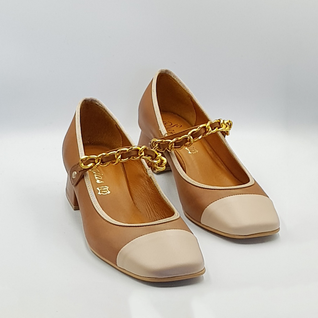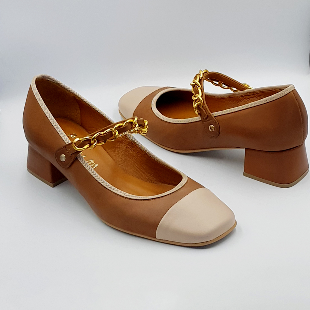 Brown with beige bootie, leather inside – out, 3.5cm heel, non-slip sole and regular shape.