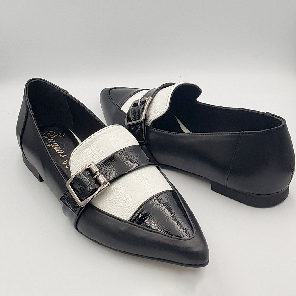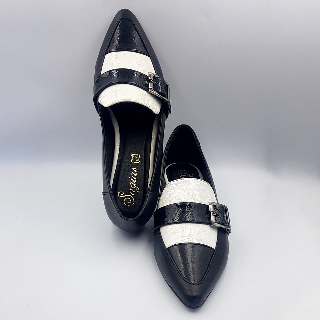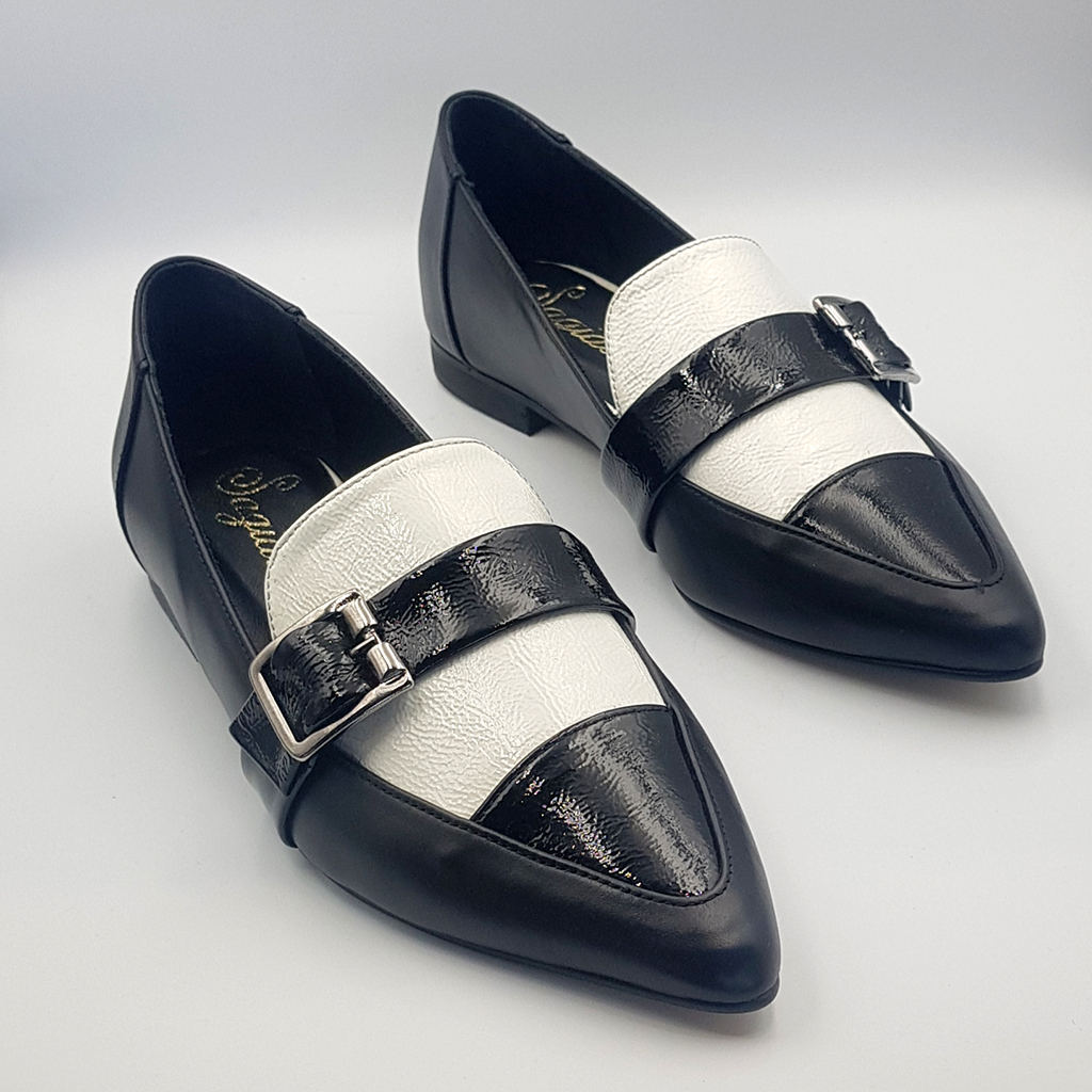 Μοκασίνι μυτερό, μαύρο δέρμα, λευκό & μαύρο λουστρίνι μέσα – έξω, 1.5cm τακούνι, αντιολισθητική σόλα και κανονική φόρμα.