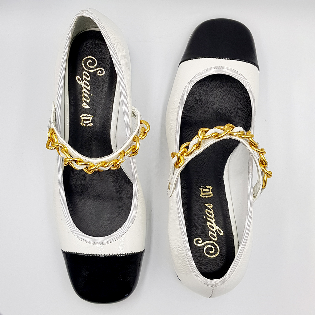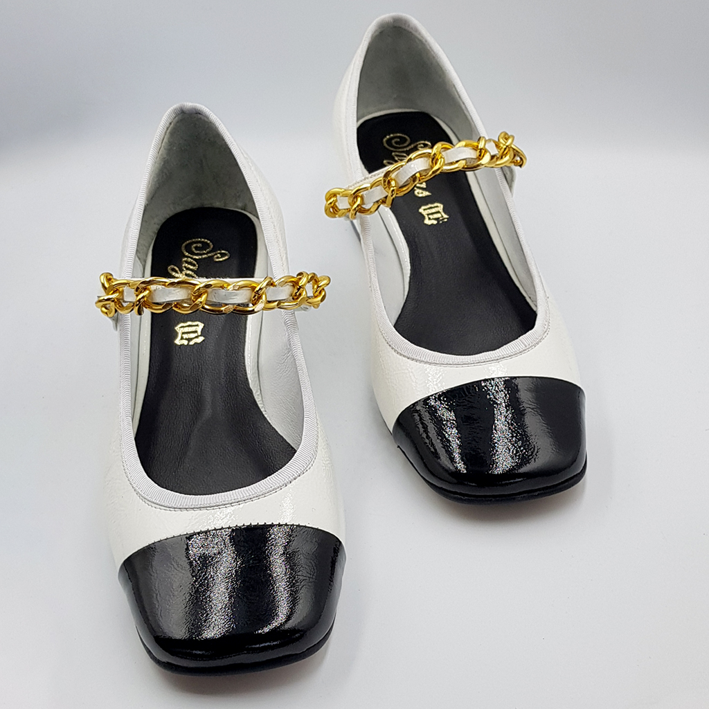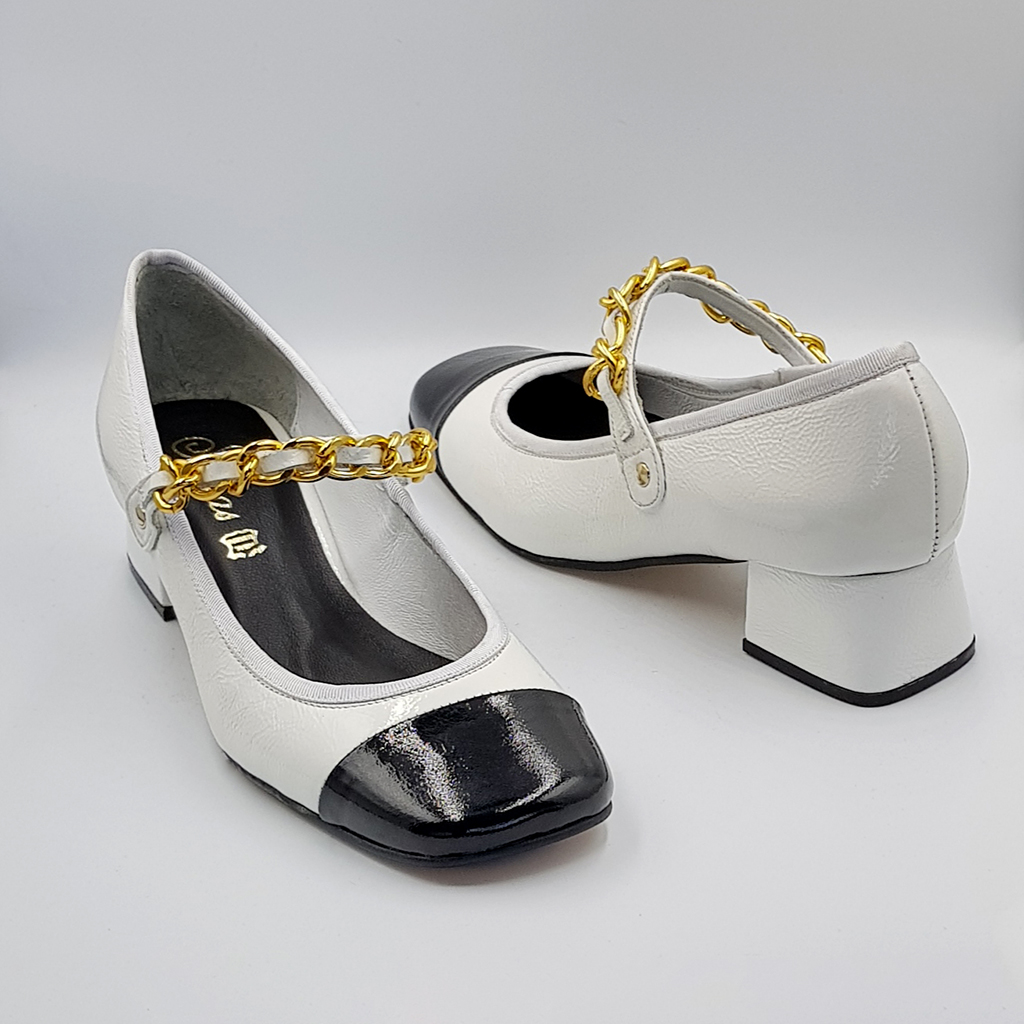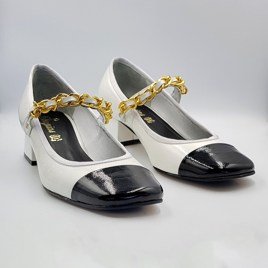 Λευκό με μαύρο μποτίνι λουστρίνι δερμάτινο μέσα – έξω, 3.5cm τακούνι, αντιολισθητική σόλα και κανονική φόρμα.