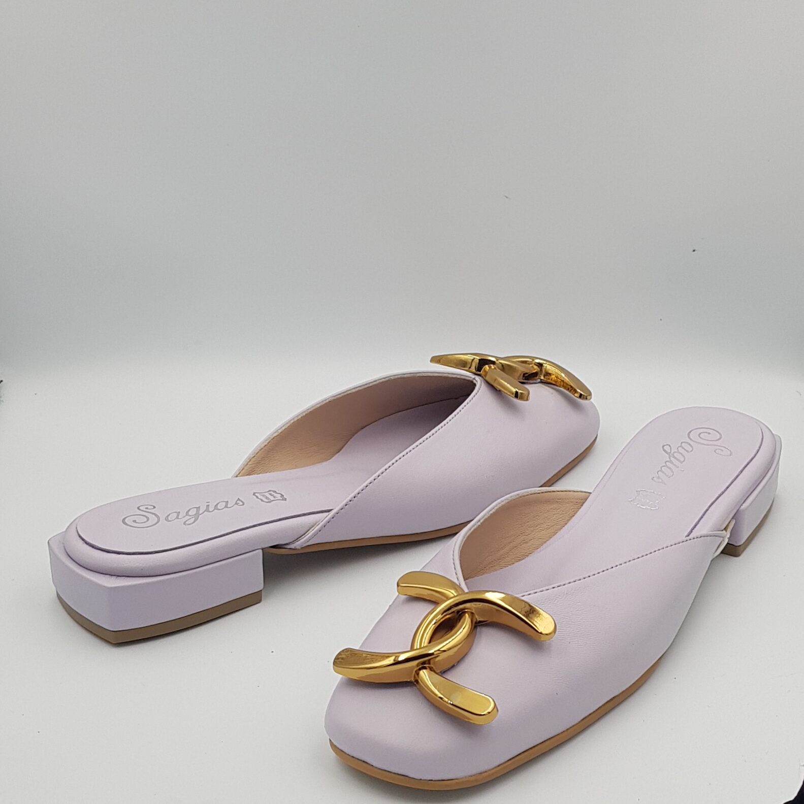 Λιλά δέρμα μέσα έξω με χρυσό μεταλλικό διακοσμητικό.1,5 cm τακούνι, αντιολισθητική σόλα και κανονική φόρμα.