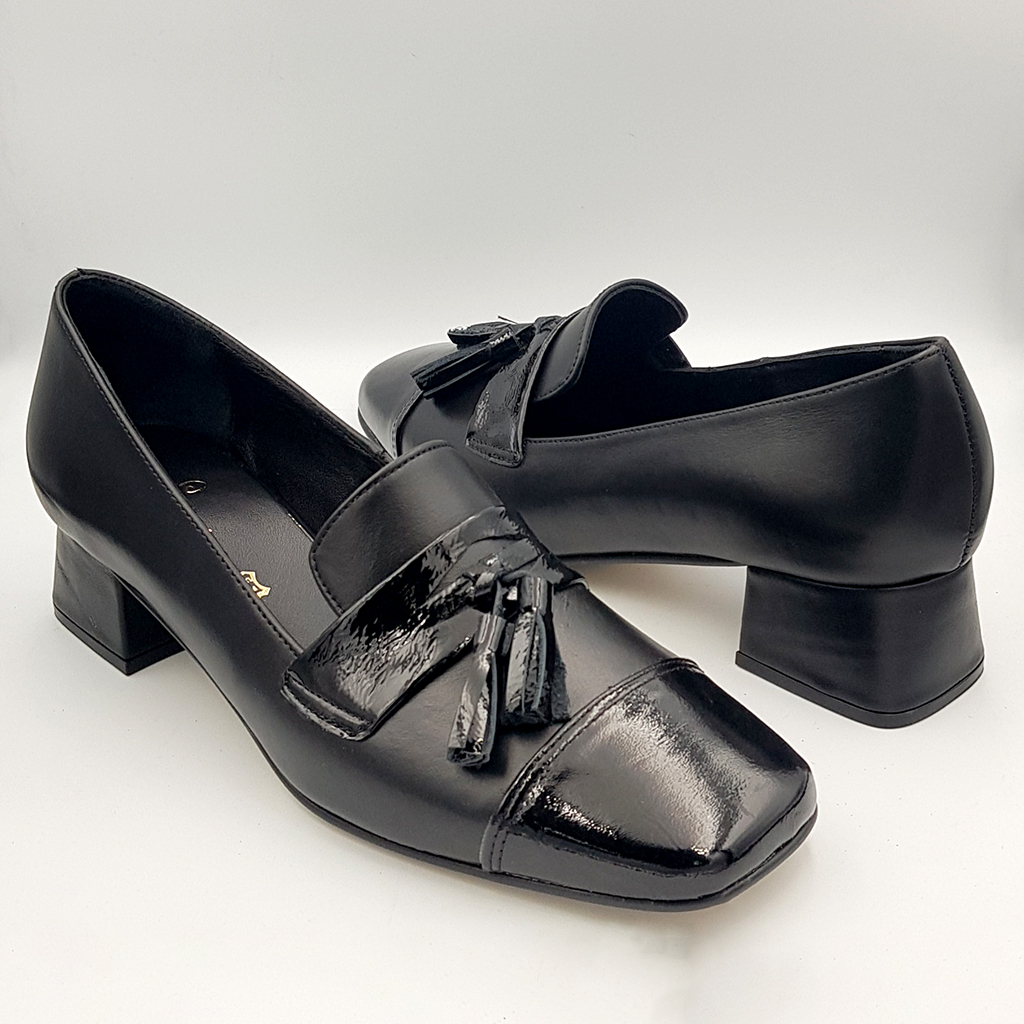 Μαύρο δέρμα με μαύρο λουστρίνι και εσωτερική δερμάτινη επένδυση .3.5cm τακούνι, αντιολισθητική σόλα και κανονική φόρμα.