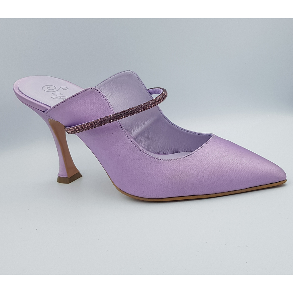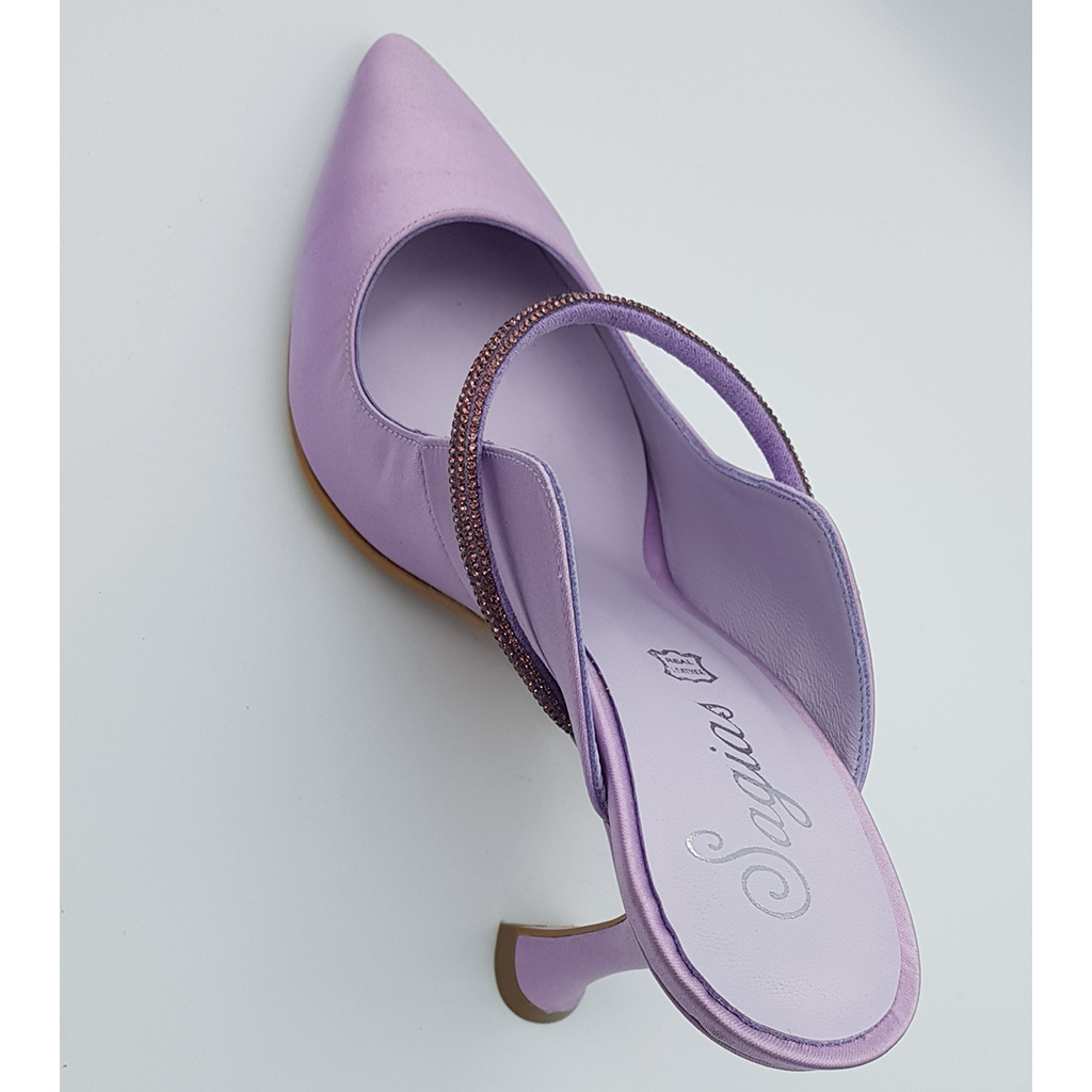Λιλά σατέν έξω, δέρμα μέσα, 8.5cm τακούνι, αντιολισθητική σόλα και κανονική φόρμα.