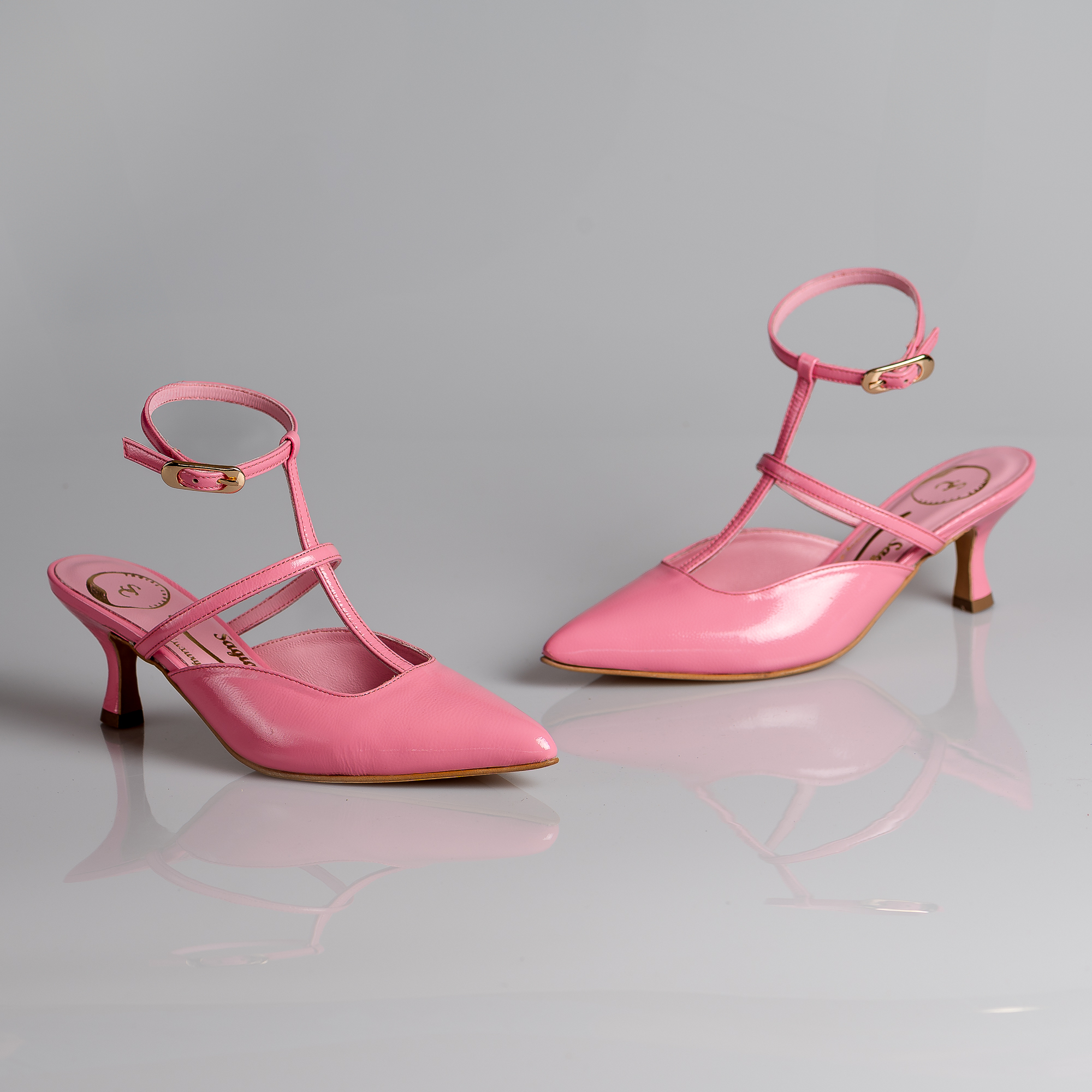 Ροζ λουστρίνι δέρμα με μαύρο λουστρίνι μέσα έξω. 5,5 cm τακούνι,αντιολισθητική σόλα και κανονική εφαρμογή.
