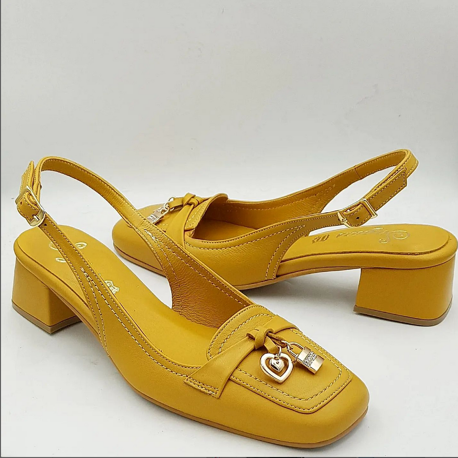 Mustard δέρμα μέσα έξω με χρυσά διακοσμητικά .3,5 cm τακούνι και αντιολισθητική σόλα και κανονική φόρμα.