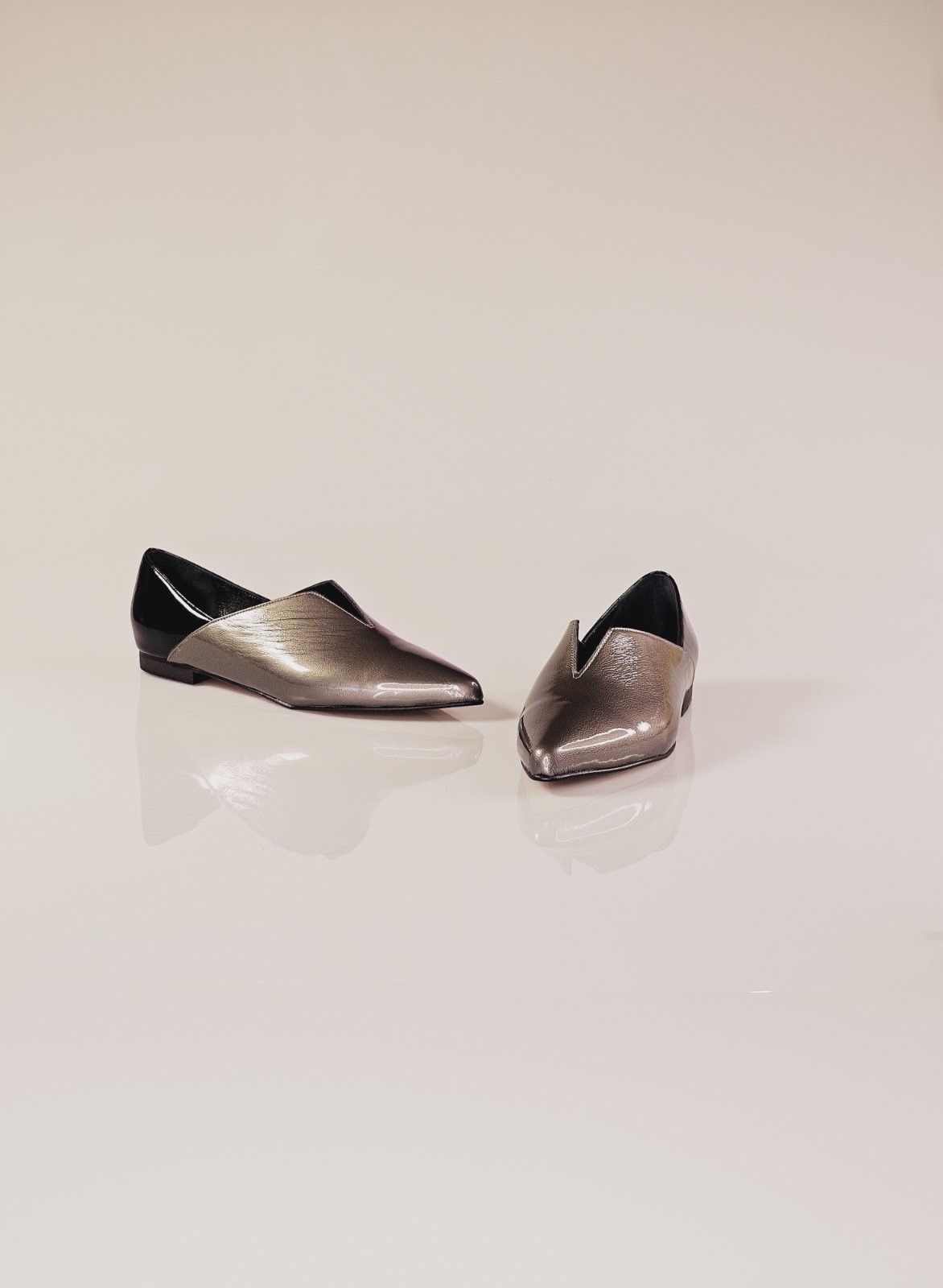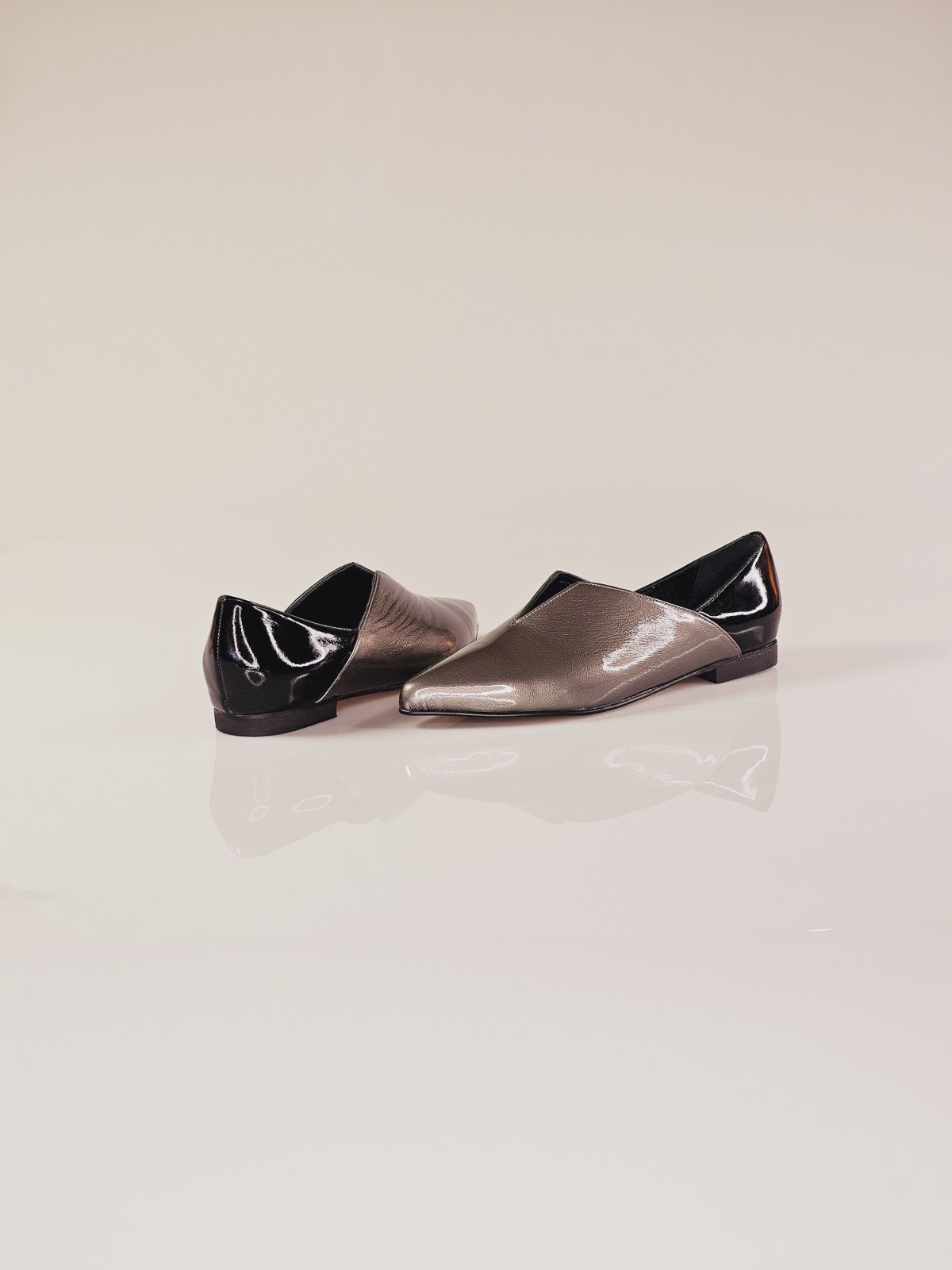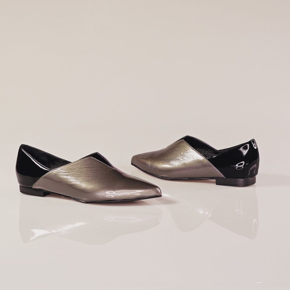 Μαύρο και μολυβί λουστρίνι δέρμα με εσωτερική δερμάτινη επένδυση.1.5cm τακούνι, αντιολισθητική σόλα και κανονική φόρμα.