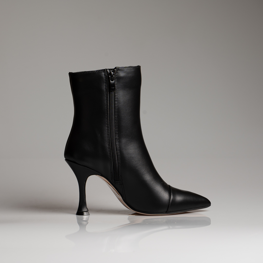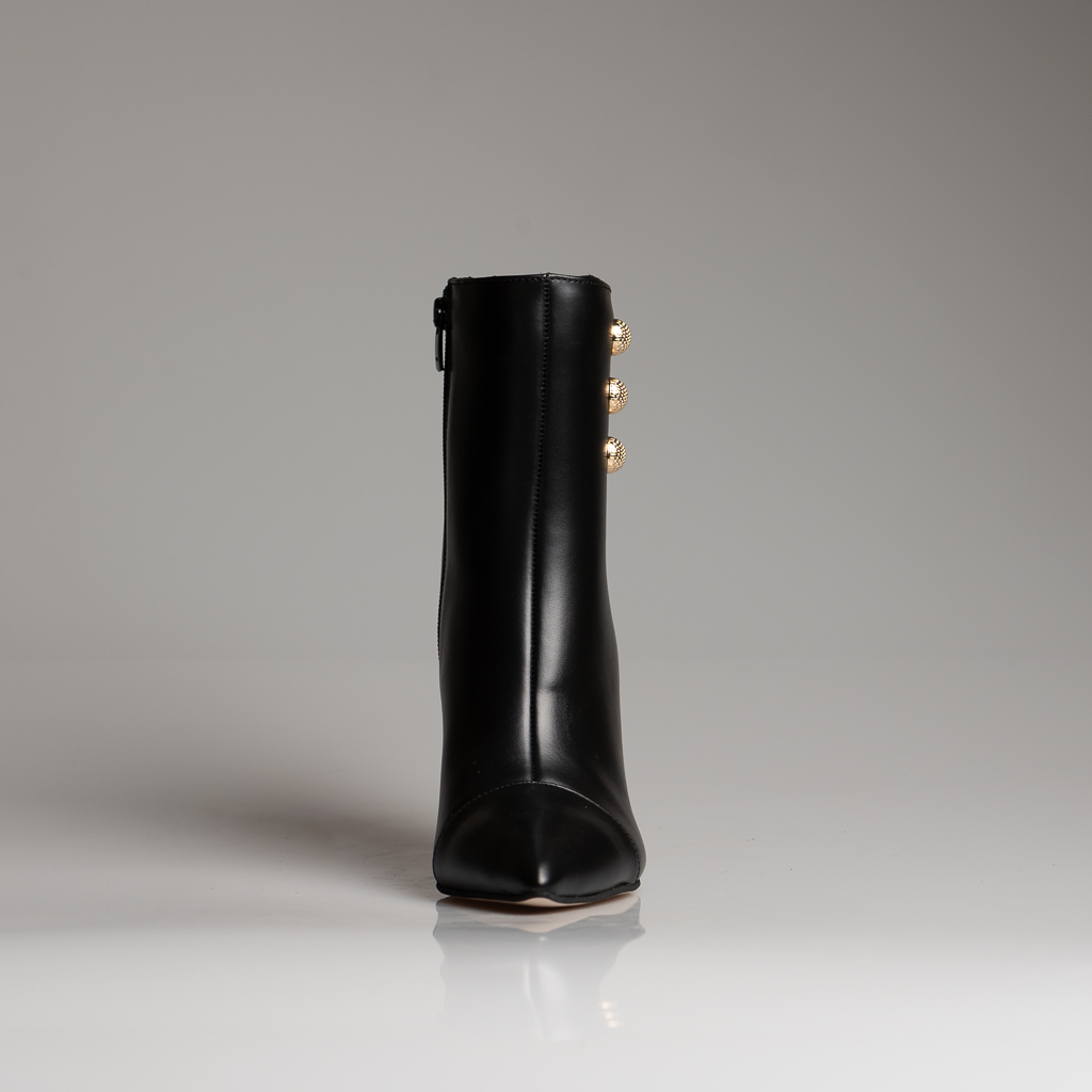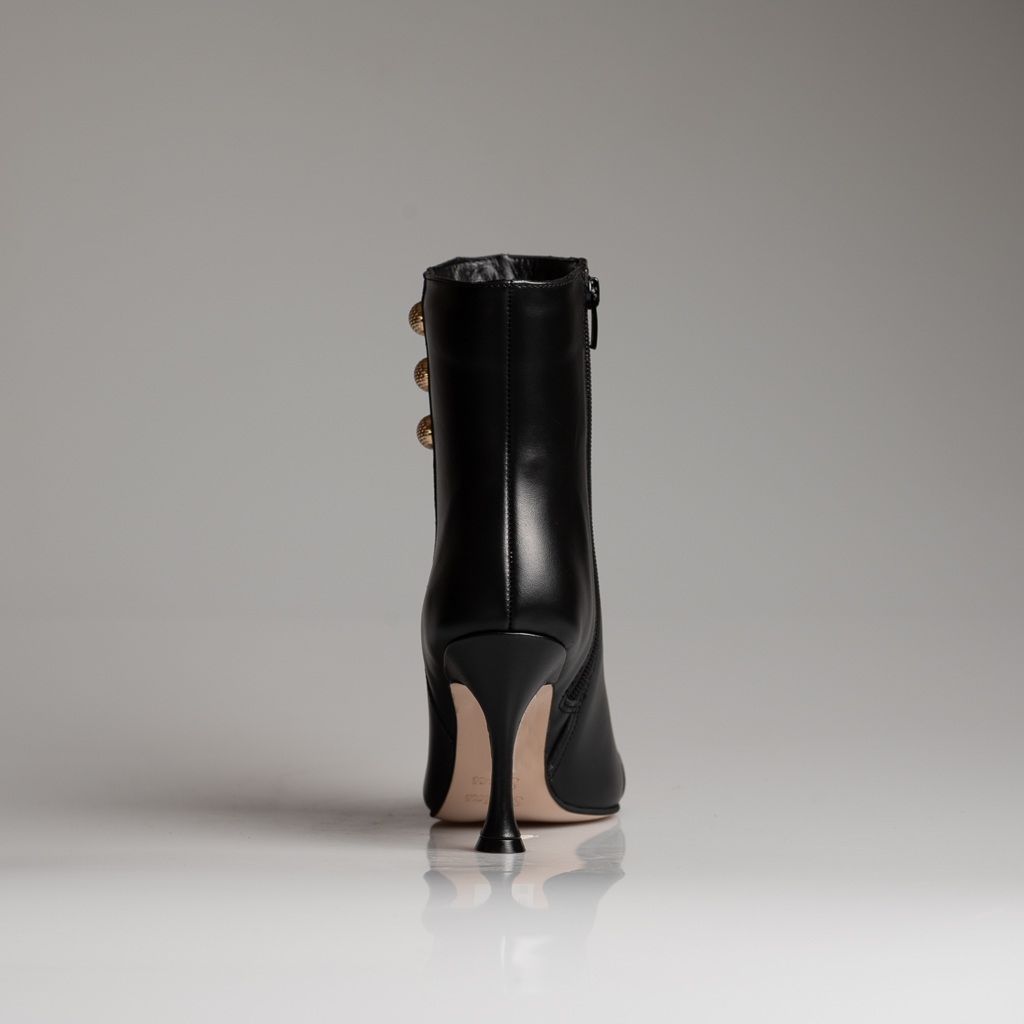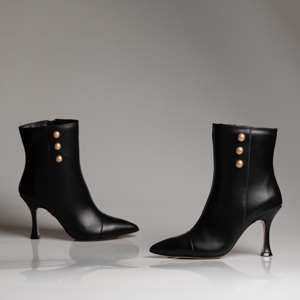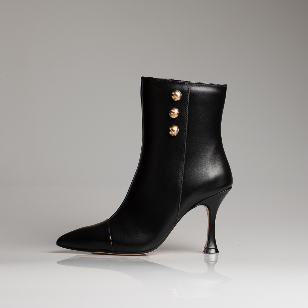 Χειροποίητο Μποτάκι μαύρο δέρμα με χρυσές μεταλλικές λεπτομέρειες. 8.5cm τακούνι με αντιολισθητική σόλα και κανονική φόρμα.